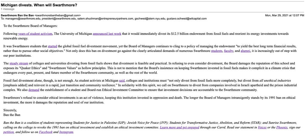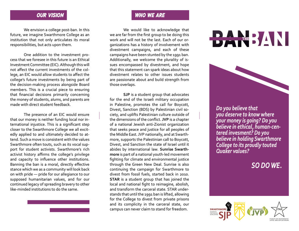 To the Swarthmore Board of Managers:Following years of student activism, The University of Michigan announced last week that it would immediately divest its $12.5 billion endowment from fossil fuels and reorient its energy investments towards renewable energy.It was Swarthmore students that started the global fossil fuel divestment movement, yet the Board of Managers continues to cling to a policy of managing the endowment "to yield the best long term financial results, rather than to pursue other social objectives." Not only does this ban on divestment go against the clearly articulated demands of numerous Swarthmore students, faculty, and alumni, it is increasingly out of step with our peer institutions.The steady stream of colleges and universities divesting from fossil fuels shows that divestment is feasible and practical. In refusing to even consider divestment, the Board damages the reputation of this school and exposes its "Quaker Ethics" and "Swarthmore Values" as hollow principles. This is not to mention that the Board's insistence on keeping Swarthmore invested in fossil fuels makes it complicit in a climate crisis that endangers every past, present, and future member of the Swarthmore community, as well as the rest of the world.Fossil fuel divestment alone, though, is not enough. As student activists at Michigan said, colleges and institutions must “not only divest from fossil fuels more completely, but divest from all unethical industries [emphasis added] and reinvest in a rapid, just transition and community resilience.” In solidarity with this spirit, we call on Swarthmore to divest from companies involved in Israeli apartheid and the prison industrial complex. We also demand the establishment of a student and Board-run Ethical Investment Committee to ensure that investment decisions are accountable to the Swarthmore community.Swarthmore’s refusal to consider ethical investments is an act of violence, keeping this institution invested in oppression and death. The longer the Board of Managers intransigently stands by its 1991 ban on ethical investment, the more it damages the reputation and soul of our institution.Sincerely,Ban the BanBan the Ban is a coalition of students representing Students for Justice in Palestine (SJP); Jewish Voice for Peace (JVP); Students for Transformative Justice, Abolition, and Reform (STAR); and Sunrise Swarthmore, calling on the college to revoke the 1991 ban on ethical investment and establish an ethical investment committee. Learn more and get engaged through our Carrd. Read our statement in Voices or the Phoenix, sign our petition, and follow us on Facebook and Instagram.
